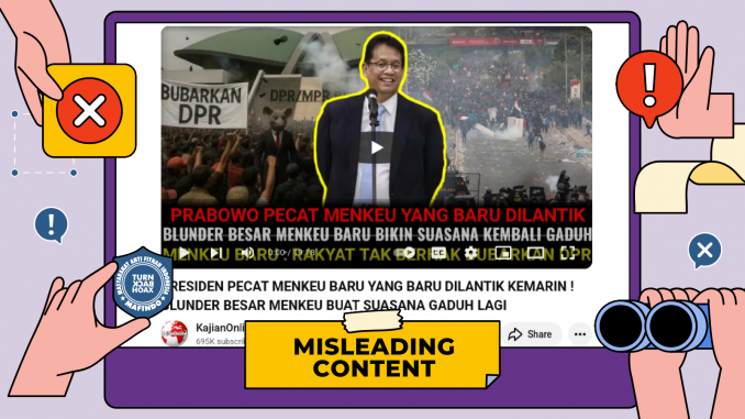 Unggahan berisi video “Prabowo pecat Menkeu yang baru dilantik” merupakan konten yang menyesatkan (misleading content).