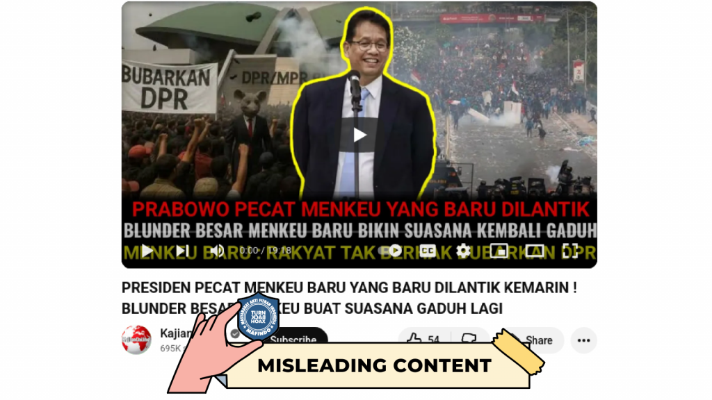 - Unggahan berisi video “Prabowo pecat Menkeu yang baru dilantik” merupakan konten yang menyesatkan (misleading content).