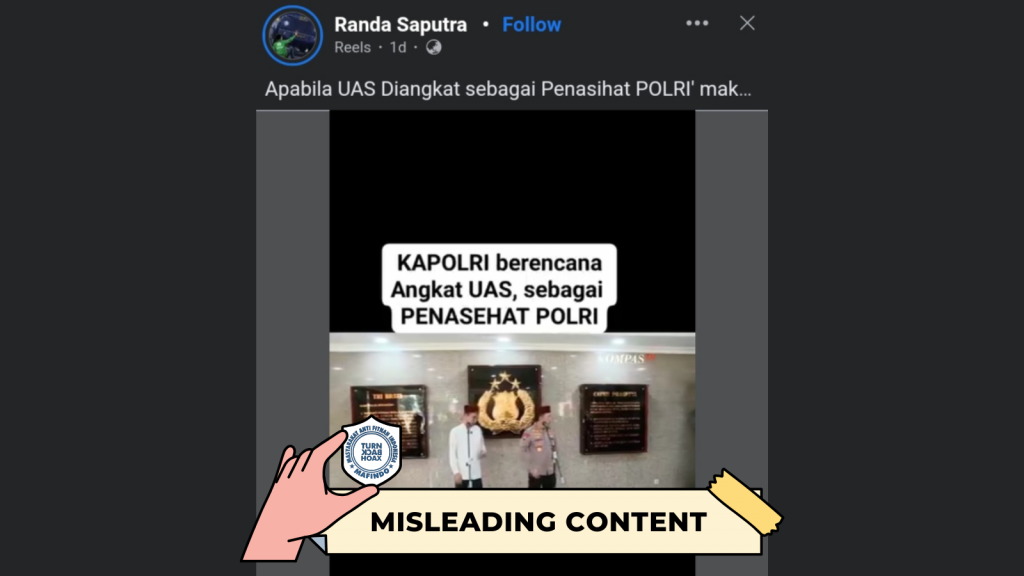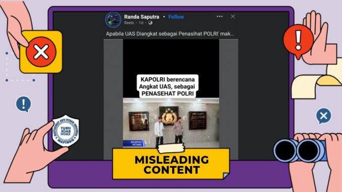 Unggahan video berisi klaim “Ustaz Abdul Somad bakal diangkat menjadi penasihat Polri” merupakan konten yang menyesatkan (misleading content).