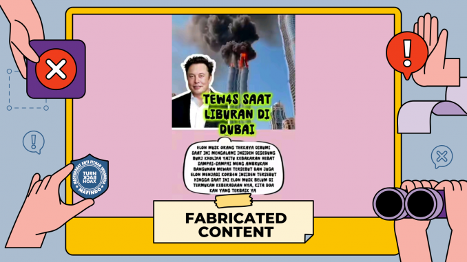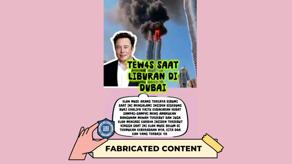 Unggahan berisi klaim “Elon Musk tewas dalam insiden kebakaran di Burj Khalifa” merupakan konten palsu (fabricated content).