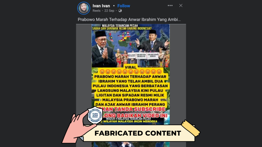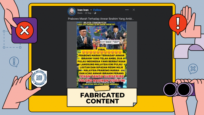 Unggahan video berisi klaim “Prabowo tantang Malaysia untuk berperang karena merebut Pulau Ligitan dan Sipadan dari Indonesia” merupakan konten palsu (fabricated content).