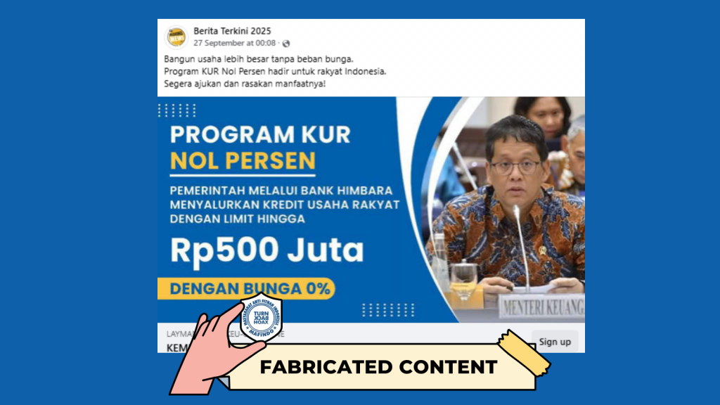 - Unggahan dengan narasi “tautan pendaftran Program KUR nol persen dari Kementrian Keuangan” merupakan konten palsu (fabricated content).