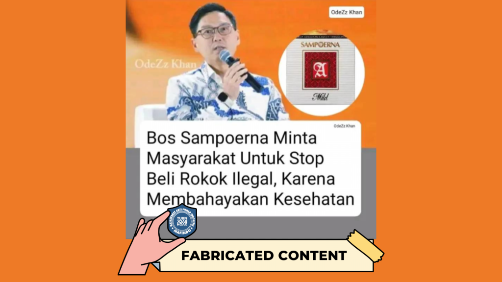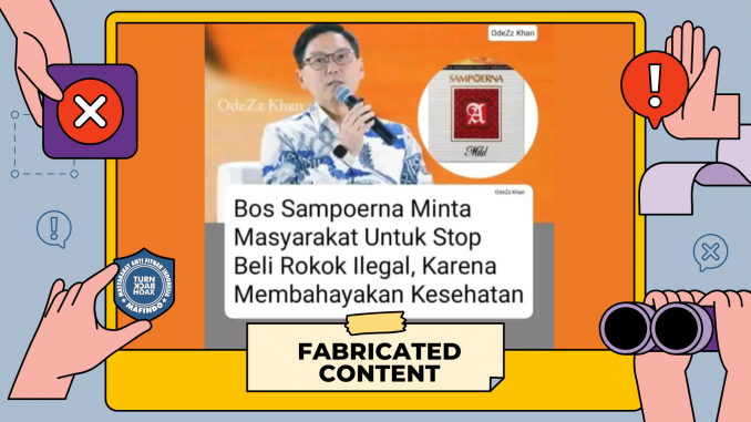 Unggahan berisi klaim “bos Sampoerna minta masyarakat untuk berhenti beli rokok ilegal karena membahayakan kesehatan” merupakan konten palsu (fabricated content).