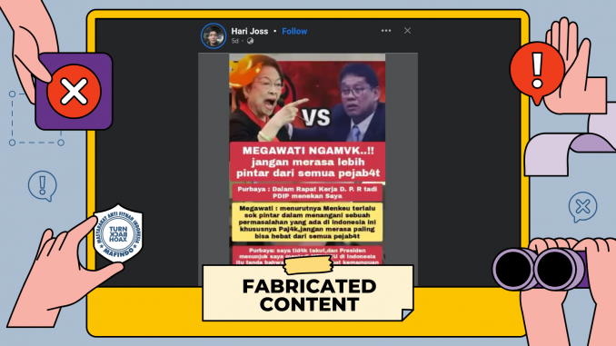 - Unggahan video berisi klaim “pernyataan Megawati ke Menkeu Purbaya: jangan merasa lebih pintar dari semua pejabat” adalah konten palsu (fabricated content).