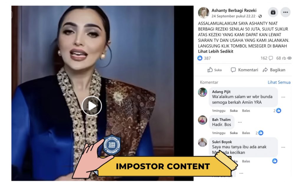 - Unggahan video berisi klaim “Ashanty bagi-bagi uang” merupakan konten tiruan (impostor content) untuk modus penipuan.