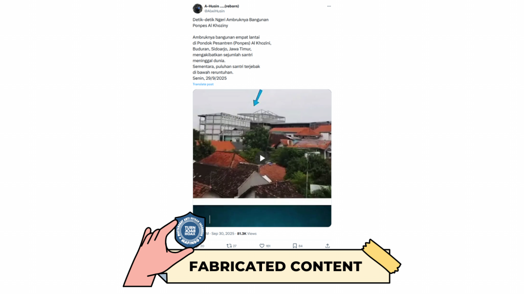 • Unggahan yang berisi klaim “Detik-detik Ngeri Ambruknya Bangunan Ponpes Al Khoziny” merupakan kategori konten palsu (fabricated content).