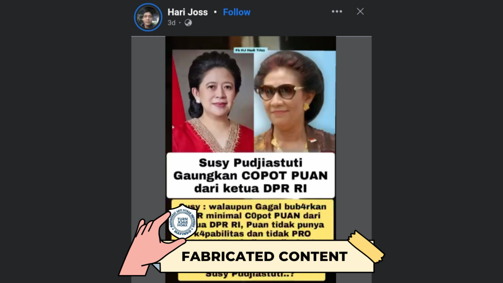 - Unggahan video berisi klaim “Susi Pudjiastuti gaungkan pencopotan Puan Maharani dari kursi Ketua DPR RI” merupakan konten palsu (fabricated content).