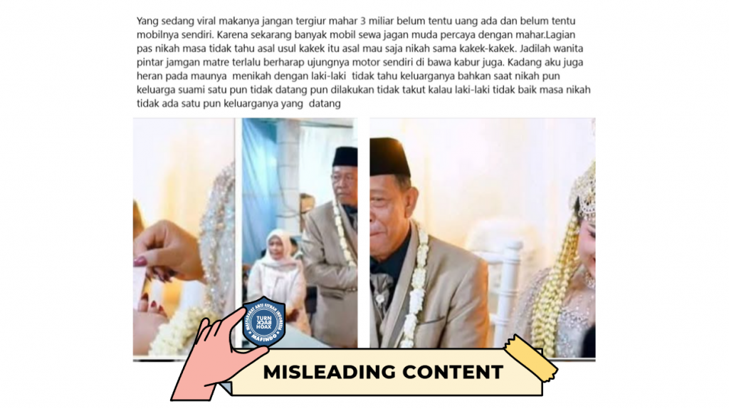- Informasi dengan klaim “seorang Kakek kabur setelah tipu mahar senilai 3 miliar” merupakan konten yang menyesatkan (misleading content).