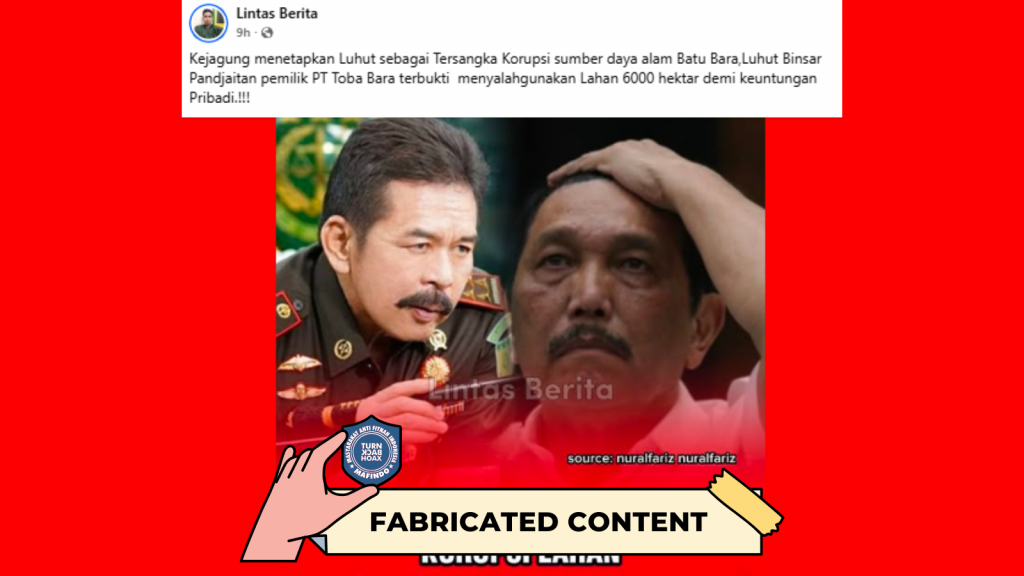 - Unggahan foto berisi klaim “Luhut jadi tersangka korupsi baru bara” adalah konten palsu (fabricated content).