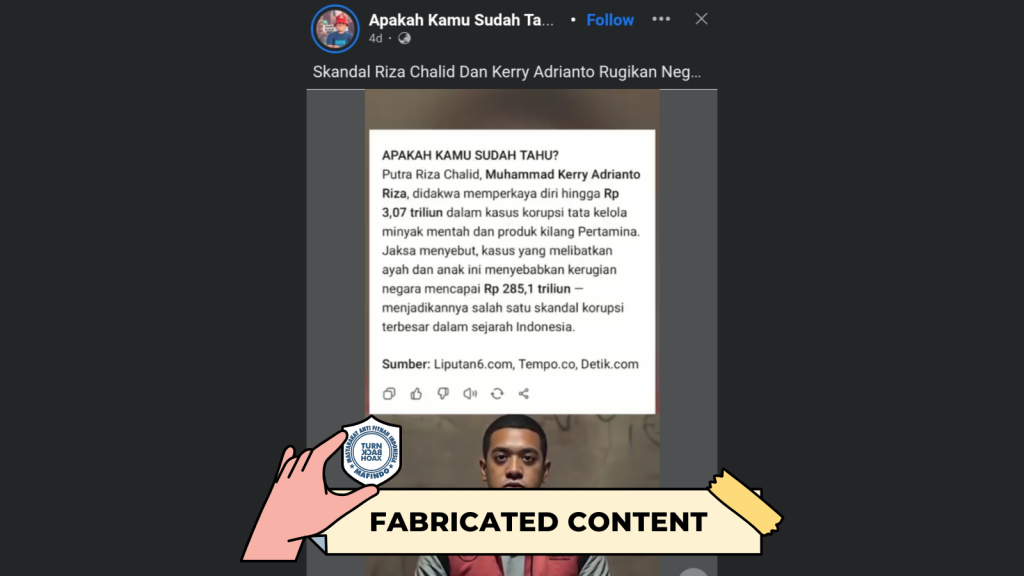 - Unggahan video berisi klaim “permintaan maaf anak Riza Chalid atas kasus korupsi Pertamina” merupakan konten palsu (fabricated content).