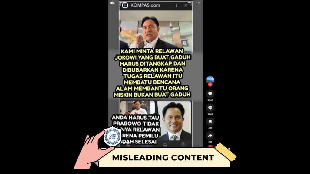 - Unggahan berisi klaim “Menko Yusril minta relawan Jokowi yang membuat gaduh ditangkap dan dibubarkan” itu merupakan konten yang menyesatkan (misleading content).