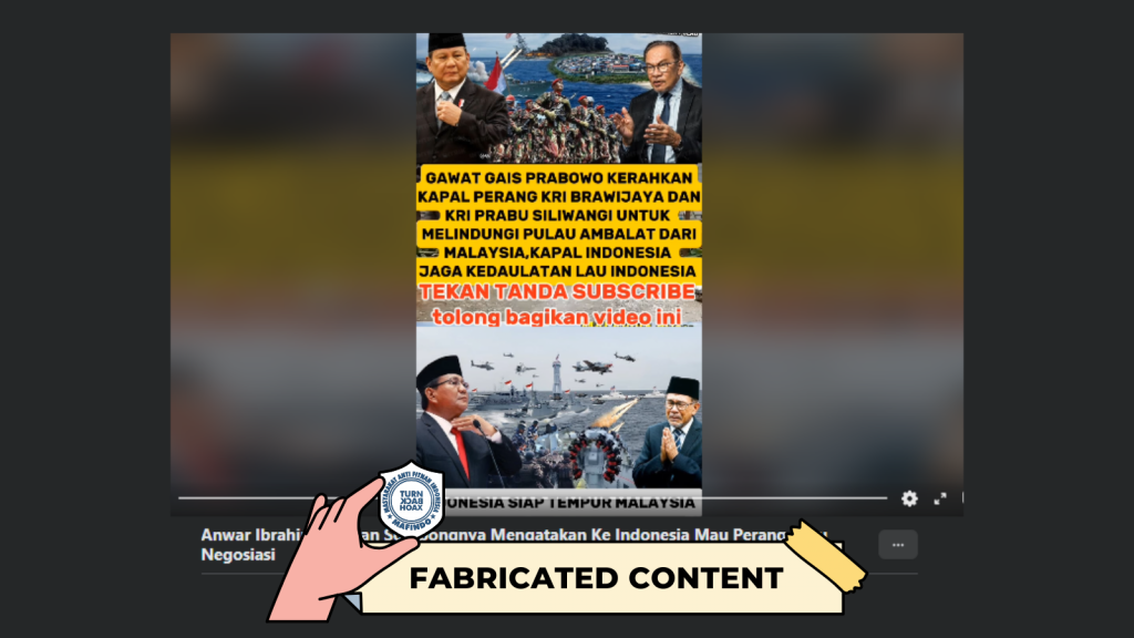 • Unggahan video berisi klaim “Prabowo kerahkan kapal perang KRI Brawijaya-320 dan KRI Prabu Siliwangi-321 untuk lindungi Ambalat dari Malaysia” merupakan konten palsu (fabricated content).