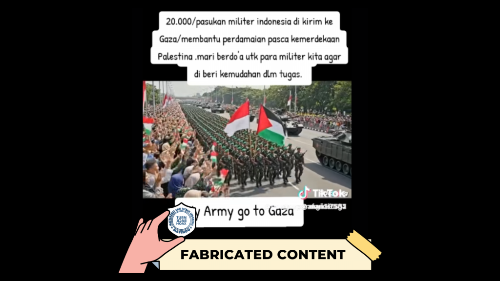 Unggahan berisi klaim “Indonesia kirim 20 ribu pasukan ke Gaza membantu perdamaian pasca kemerdekaan Palestina” merupakan konten palsu (fabricated content).