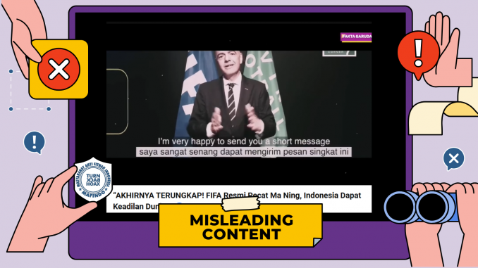 - Unggahan video berisi klaim “FIFA pecat wasit Ma Ning setelah laga Indonesia vs Irak” adalah konten yang menyesatkan (misleading content).