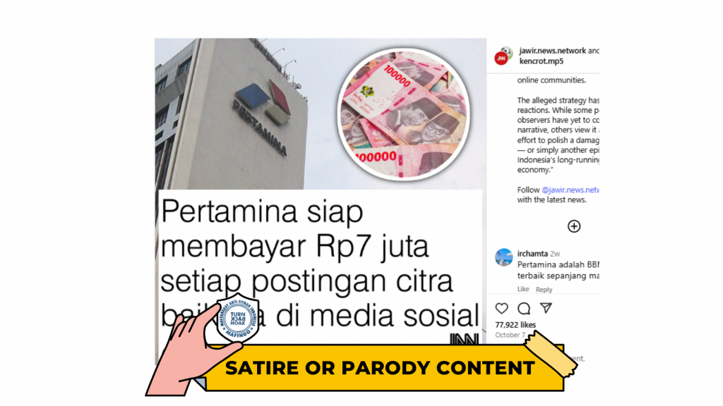 Unggahan dengan narasi “Pertamina berikan imbalan Rp7 juta untuk postingan citra Pertamina di media sosial” merupakan konten parodi (parody content).