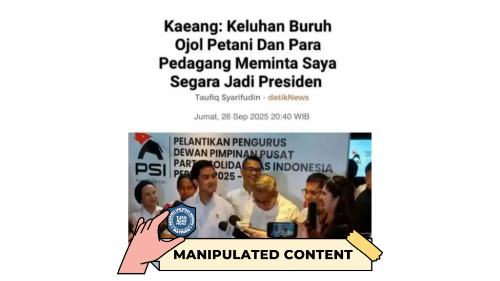 Diketahui, kreator konten yang diunggah akun Facebook “Amir Bintang” telah menyunting pemberitaan detik.com “Kaesang Ungkap Alasan Giring Ganesha Tak Masuk Kepengurusan Baru PSI”, tayang Jumat (26/9/2025).