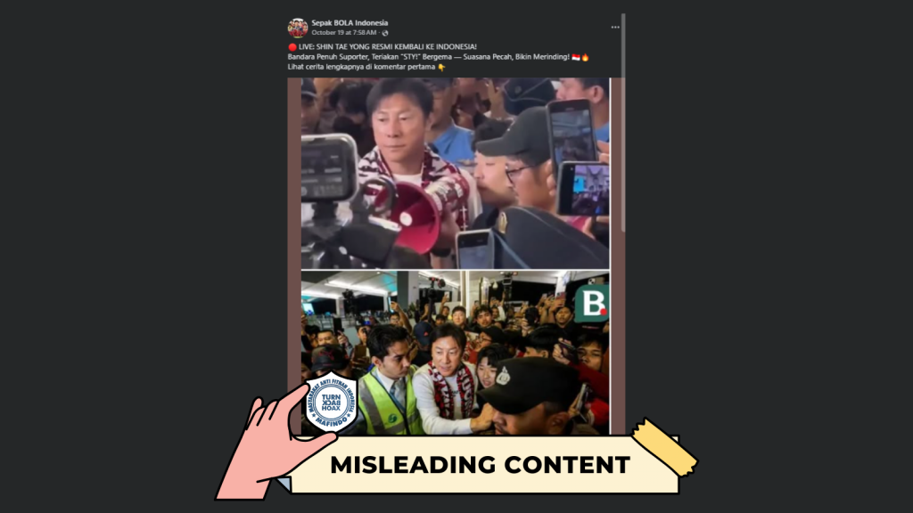 - Unggahan berisi klaim “Shin Tae-yong resmi kembali ke Indonesia untuk melatih Timnas” adalah konten yang menyesatkan (misleading content).