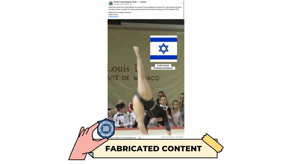 Unggahan foto berisi klaim Indonesia terancam diskualifikasi IOC karena menolak visa atlet Israel merupakan kategori konten palsu (fabricated content), faktanya foto yang dibagikan adalah dokumentasi dari acara Princess Grace International Gymnastics Gala di Monaco pada tahun 2019 lalu.