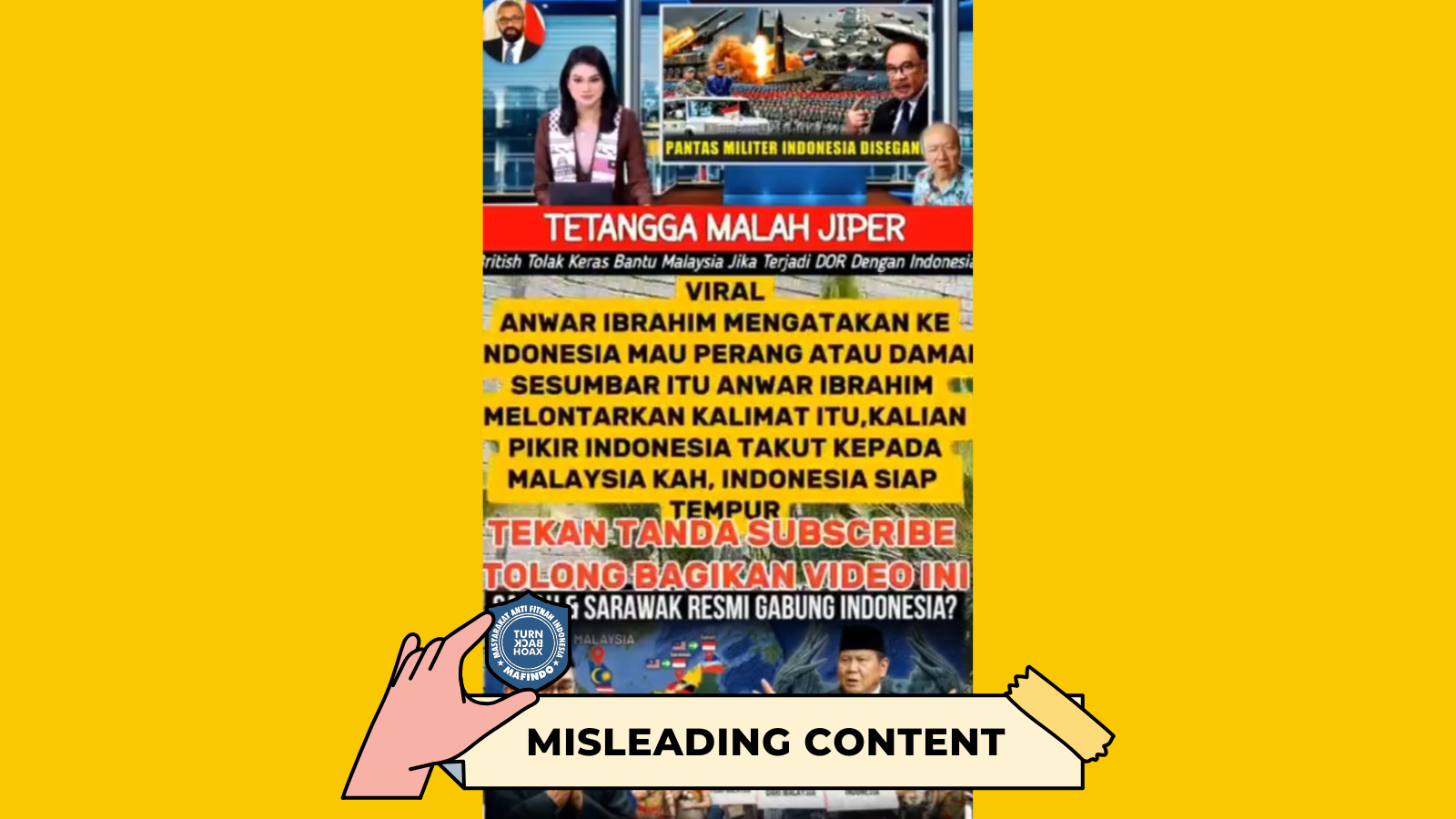 - Unggahan video berisi klaim “pernyataan PM Malaysia ke Indonesia: mau damai atau perang?” merupakan konten yang menyesatkan (misleading content).