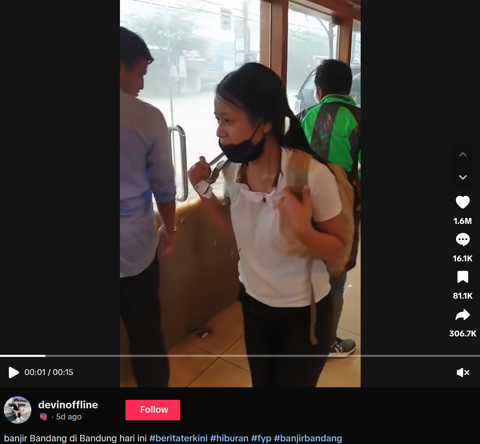 Akun TikTok “devinoffline” pada Rabu (15/10/2025) membagikan video [arsip] yang memperlihatkan adanya banjir bandang yang menyebabkan pintu kaca sebuah bangunan pecah.