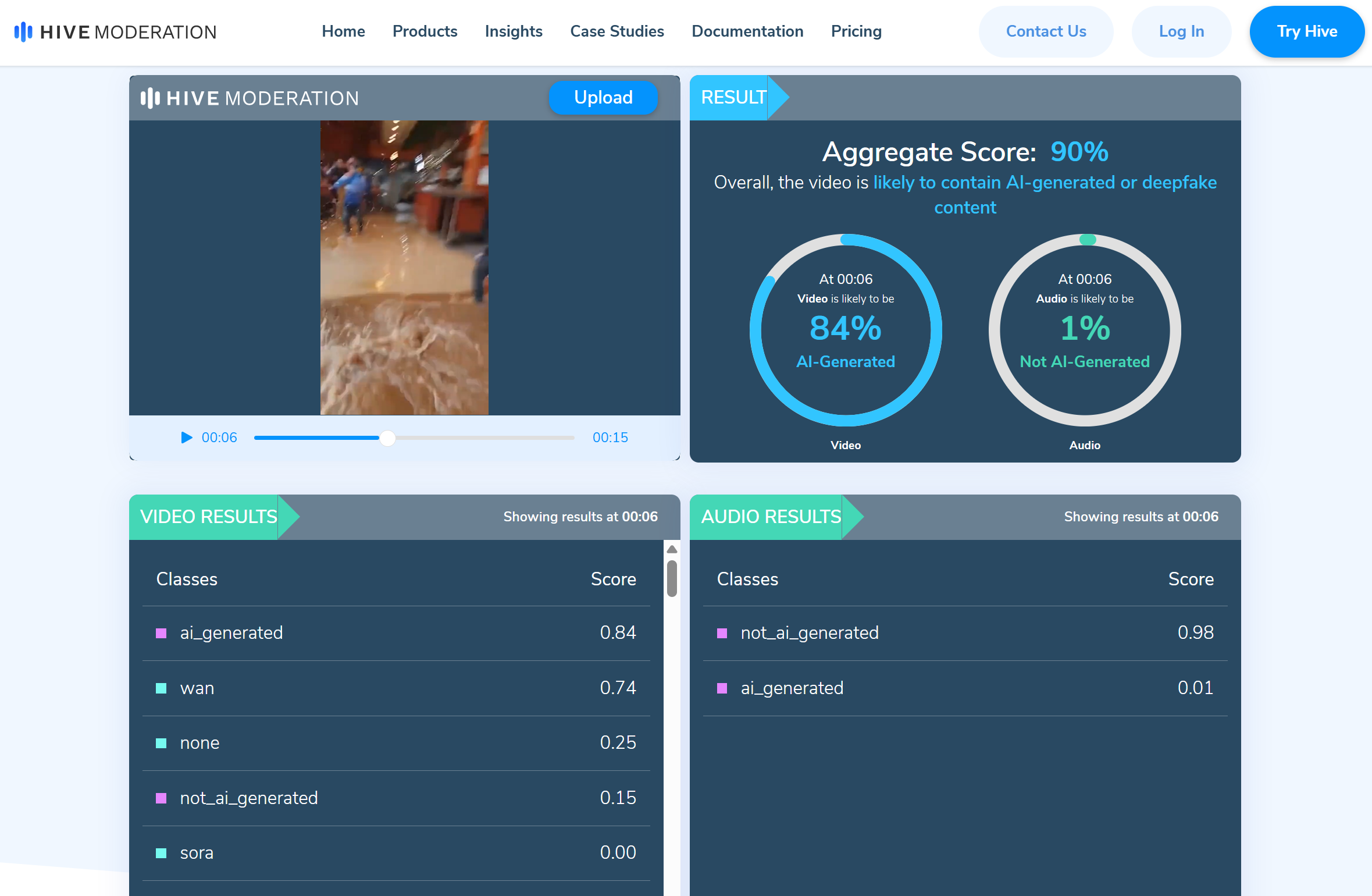 TurnBackHoax kemudian mengunduh video itu dan mengunggahnya ke alat pendeteksi AI Hive Moderation. Hasil analisa menunjukkan, video yang beredar adalah hasil rekayasa AI, kemungkinan atau probabilitasnya mencapai 90%.