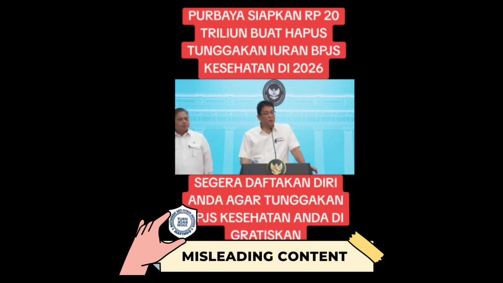 - Unggahan berisi klaim “pendaftaran program penghapusan tunggakan BPJS kesehatan dari Purbaya yang siapkan 20 triliun” merupakan konten yang menyesatkan (misleading content).