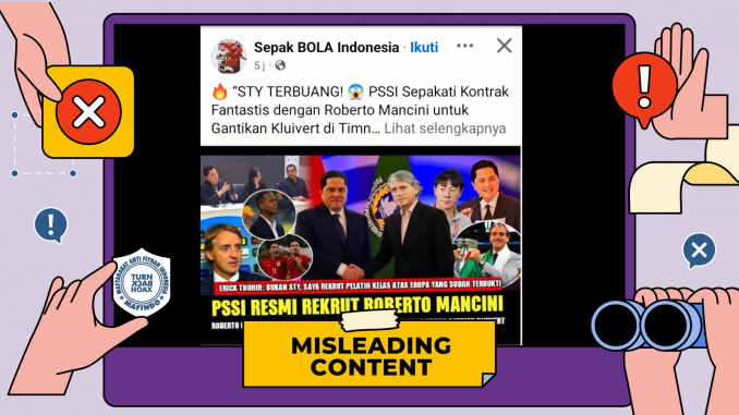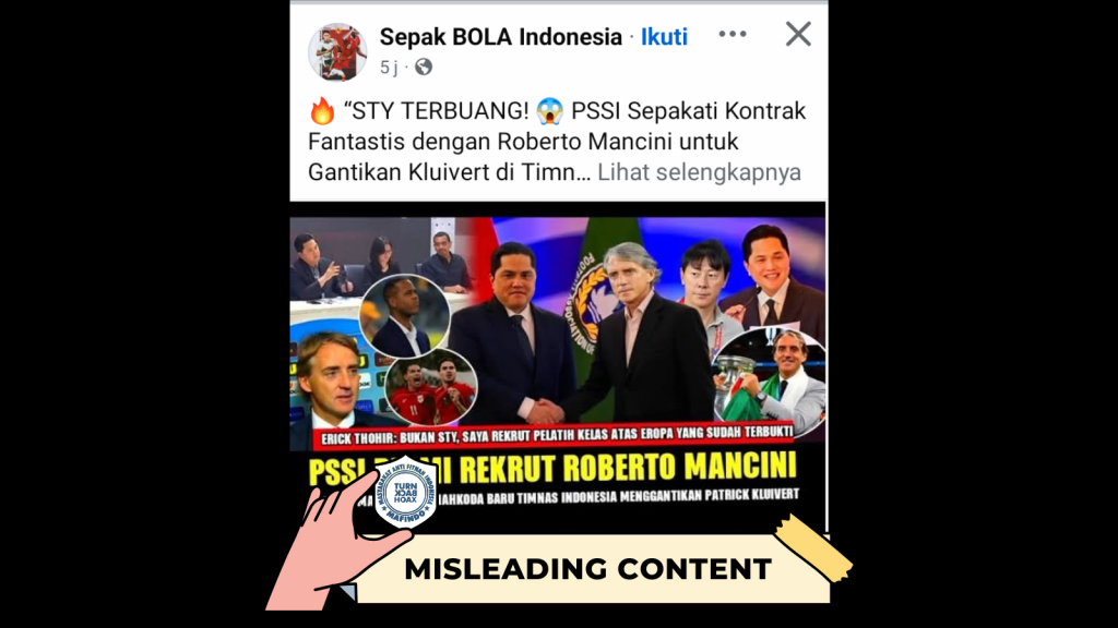 • Unggahan berisi klaim “PSSI resmi tunjuk Roberto Mancini gantikan Patrick Kluivert” merupakan konten yang menyesatkan (misleading content).