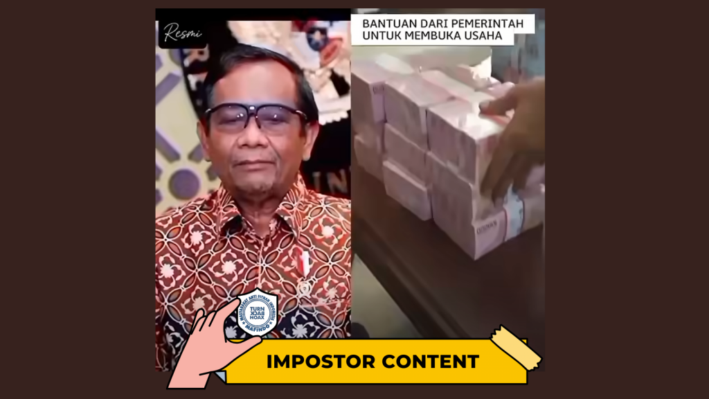 - Unggahan video berisi klaim “Mahfud MD bagi-bagi bansos hasil perampasan aset” merupakan konten tiruan (impostor content).