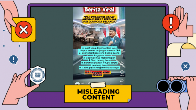 Unggahan berisi klaim ”Prabowo mendapat surat terbuka dari diaspora Belanda berisi 6 tuntutan” adalah konten yang menyesatkan (misleading content).