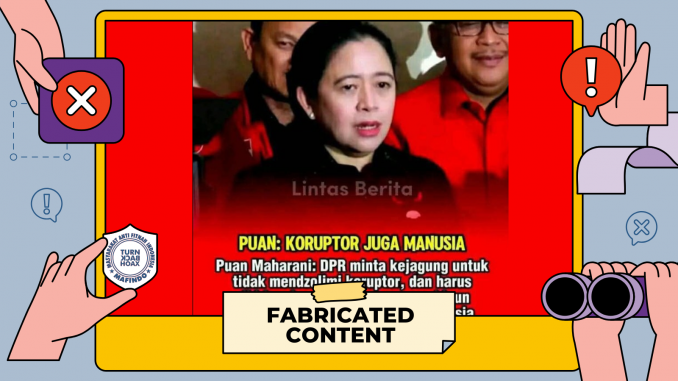 - Unggahan berisi klaim “Puan ke Kejagung: Negara tidak boleh menzalimi koruptor” merupakan konten palsu (fabricated content).