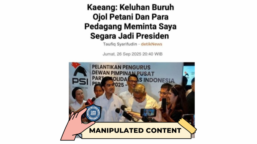 - Unggahan berisi klaim “berita detik sebut petani dan pedagang minta kaesang segera jadi presiden” merupakan konten yang dimanipulasi (manipulated content).