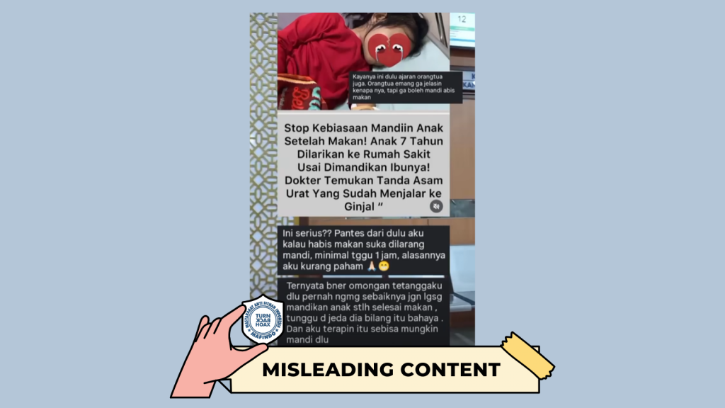 Unggahan video berisi klaim “mandi setelah makan picu asam urat pada anak” merupakan konten yang menyesatkan (misleading content).