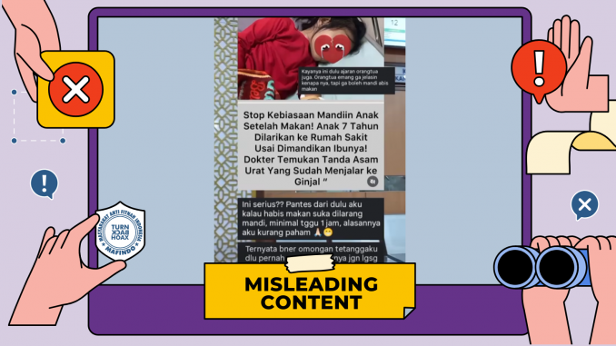 Unggahan video berisi klaim “mandi setelah makan picu asam urat pada anak” merupakan konten yang menyesatkan (misleading content).