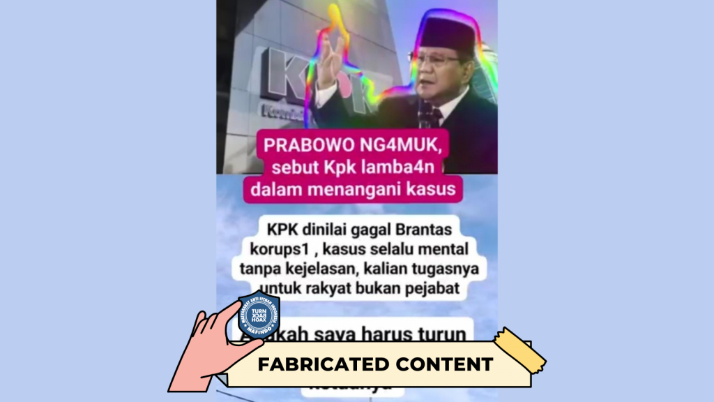 Unggahan video berisi klaim “Presiden Prabowo sebut KPK lamban dalam menangani kasus” merupakan konten palsu (fabricated content).