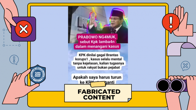 Unggahan video berisi klaim “Presiden Prabowo sebut KPK lamban dalam menangani kasus” merupakan konten palsu (fabricated content).