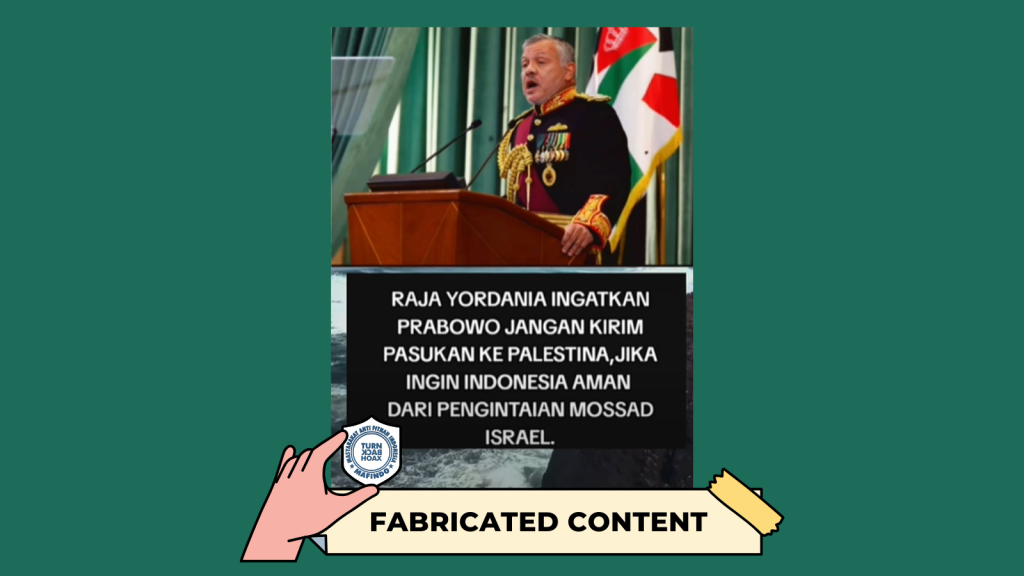 Unggahan berisi klaim “Raja Yordania ingatkan Prabowo agar tak kirim pasukan ke Palestina karena Mossad” adalah konten palsu (fabricated content).