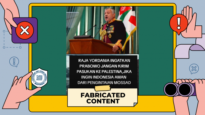 Unggahan berisi klaim “Raja Yordania ingatkan Prabowo agar tak kirim pasukan ke Palestina karena Mossad” adalah konten palsu (fabricated content).