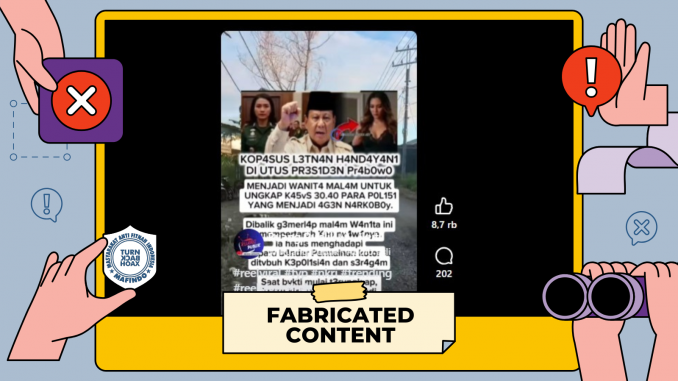 Unggahan berisi klaim “Prabowo perintahkan Letnan Handayani untuk menyamar demi ungkap polisi yang jadi agen narkoba” merupakan konten palsu (fabricated content).