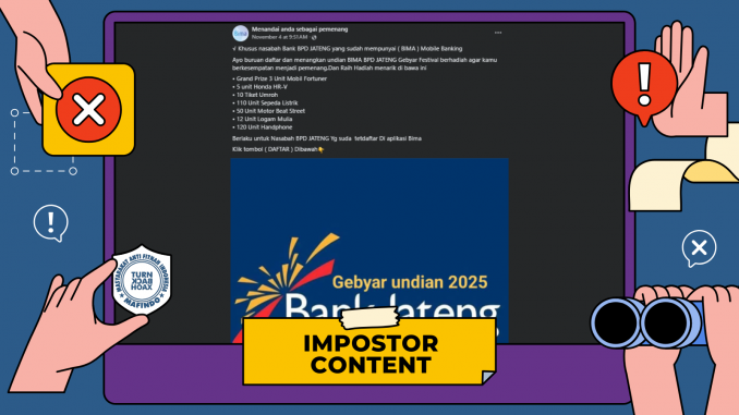 Unggahan berisi tautan “undian berhadiah Bank Jateng” yang mengarah ke laman tak resmi itu merupakan konten tiruan (impostor content).
