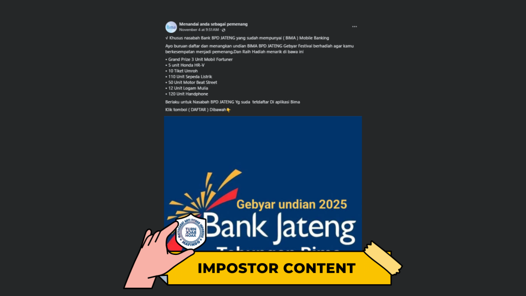 - Unggahan berisi tautan “undian berhadiah Bank Jateng” yang mengarah ke laman tak resmi itu merupakan konten tiruan (impostor content).