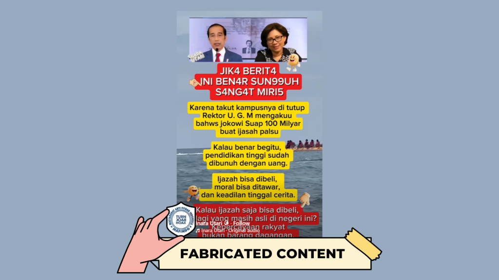 - Unggahan berisi klaim “Rektor UGM mengaku Jokowi menyuap Rp100 miliar untuk ijazah palsu” adalah konten palsu (fabricated content).