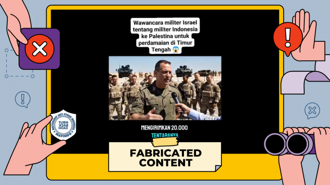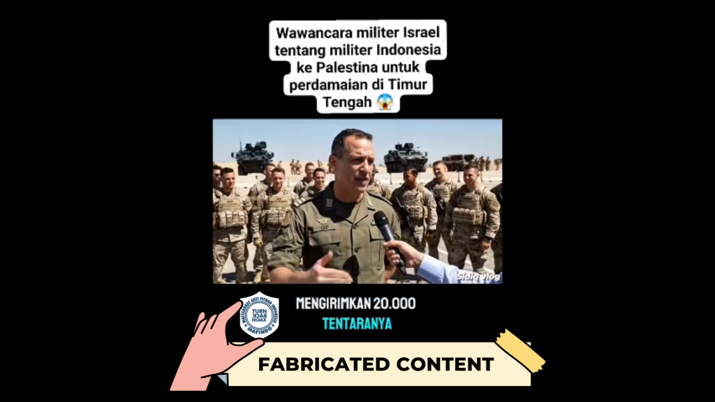 Unggahan berisi klaim “wawancara militer Israel tentang militer Indonesia ke Palestina untuk perdamaian di Timur Tengah” merupakan konten palsu (fabricated content).