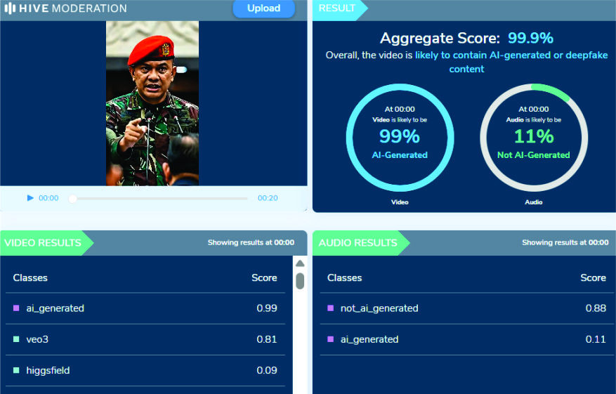 Tim Pemeriksa Fakta Mafindo (TurnBackHoax) menganalisis konten menggunakan alat pendeteksi AI, Hive Moderation. Diketahui, video merupakan hasil rekayasa kecerdasan buatan (artificial intelligence/AI), probabilitas atau kemungkinannya mencapai 99,9 persen.