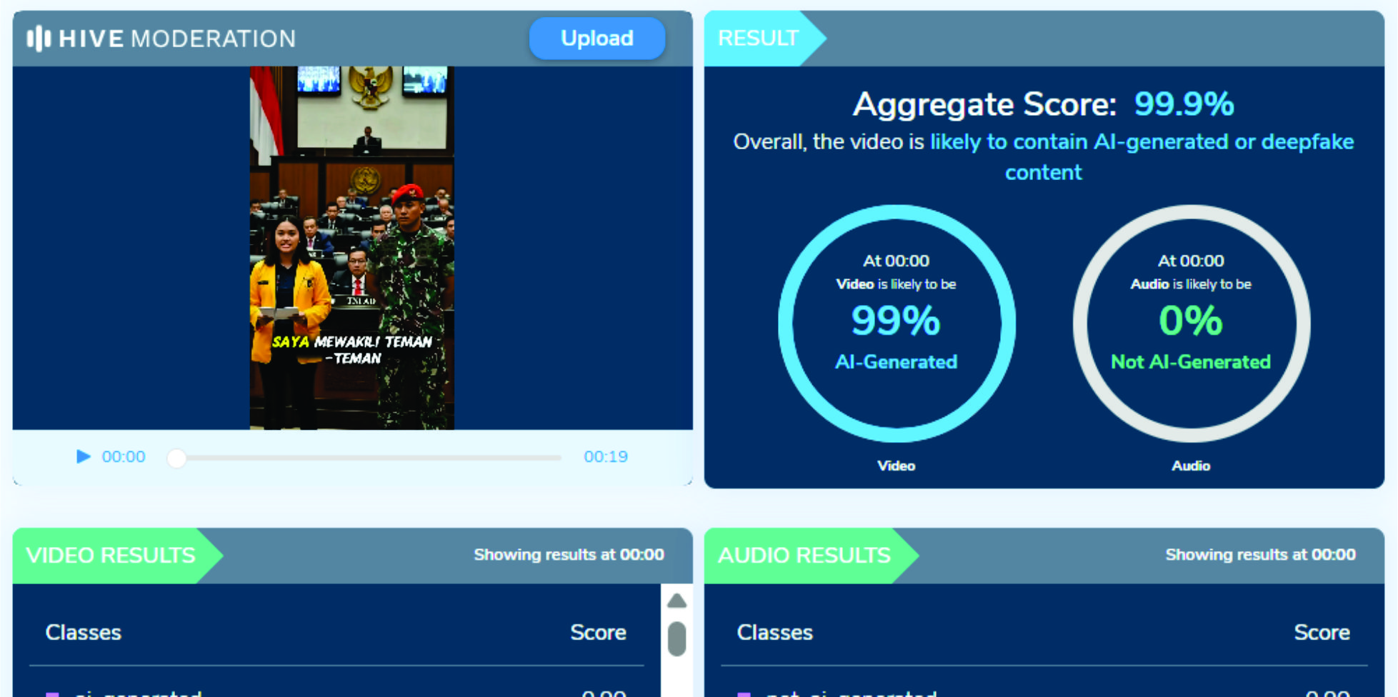 Tim Pemeriksa Fakta Mafindo (TurnBackHoax) menganalisis konten menggunakan alat pendeteksi AI, Hive Moderation. Diketahui, video merupakan hasil rekayasa kecerdasan buatan (artificial intelligence/AI), probabilitas atau kemungkinannya mencapai 99,9 persen.