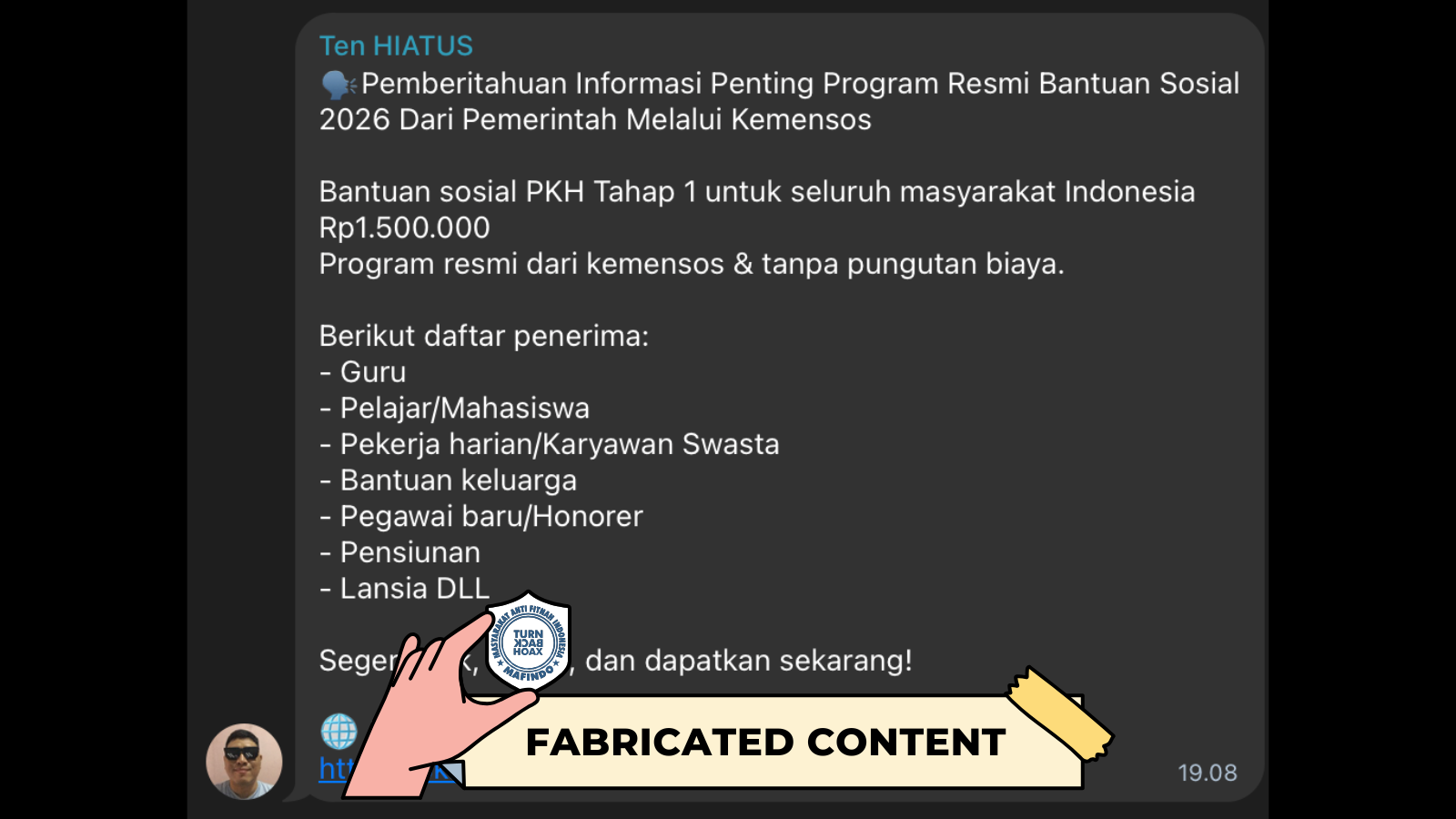 Tim Pemeriksa Fakta Mafindo (TurnBackHoax) melakukan penelusuran terhadap tautan yang dicantumkan di pesan yang beredar tersebut. Hasil pemeriksaan menunjukkan bahwa tautan tersebut tidak mengarah ke situs resmi pemerintah seperti kemensos.go.id atau cekbansos.kemensos.go.id, melainkan ke sebuah laman yang menampilkan formulir digital dan meminta pengunjung mengisi data pribadi, seperti nama lengkap serta nomor Telegram.